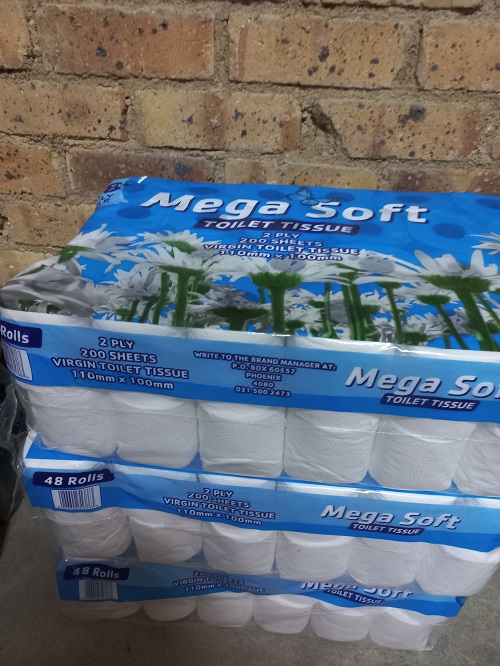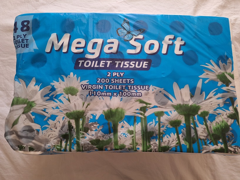 Mega Soft premium toilet paper. Soft white virgin tissue.